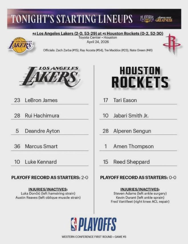 G3是火箭主场作战,首发阵容为阿门+谢泼德+申京+小史密斯+伊森;湖人首发阵容为肯纳德+斯玛特+艾顿+八村塁+詹姆斯。